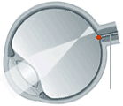 Die Lichtstrahlen treffen auf Stäbchen und Zapfen. Stäbchen vermitteln Farbreize, Zapfen Reize nach Helligkeit.