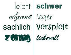 Unter Schriftcharakter versteht man Merkmale wie Schriftgattung, Schnitt, Größe oder Strichstärke, Rundungen, Serifen usw., aber auch Anmutungen bzw. Wirkung einer Schrift, auch Duktus genannt. Bei aller Schriftgestaltung hat eine optimale Lesbarkeit stets Vorrang: “Typografie ist Dienstleistung” Schriften haben gewisse Anmutungen wie weich — hart, elegant — langweilig, seriös — kindisch, … Dies kann durchaus gezielt angewendet werden, um neben dem rationalen inhaltlichen Erfassen eine thematische Veranschaulichung oder emotionale Einstimmung zu verstärken – jedoch nur bei großen Schriften; z.B. in Headlines, dann aber als Schriftgrafik. |